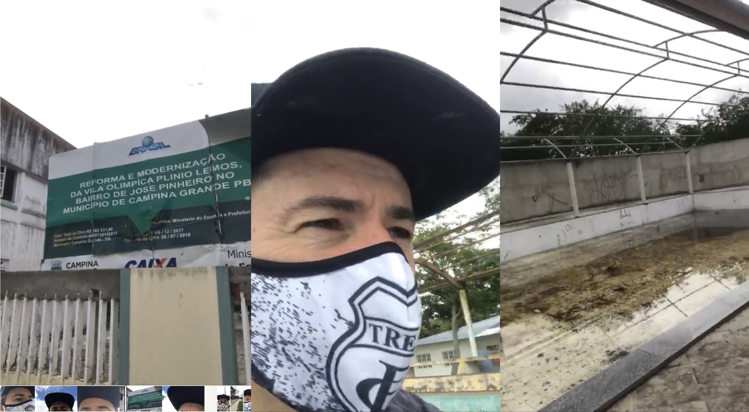 Do lado oposto ao da entrada principal, Veneziano mostrou o desprezo com a pista de skate e os equipamentos da academia popular, totalmente danificados e enferrujados, sem condição de uso. Contornando mais um pouco, ele mostrou a piscina, abandonada, servindo apenas de criadouro para mosquitos; e o abandono do Ginásio de Esportes Joselito Pereira de Lucena, também abandonado e com tudo quebrado.