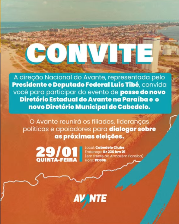A posse do novo Diretório Estadual do Avante na Paraíba e do Diretório Municipal de Cabedelo será oficializada em evento convocado pela Direção Nacional do partido. O convite foi assinado pelo presidente nacional da legenda e deputado federal Luís Tibé, e é direcionado a filiados, lideranças políticas e apoiadores.